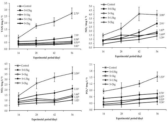 Variation in concentrations of total ammonia nitrogen (TAN), nitrite (NO2−), nitrate (NO3−), and phosphate (PO43−) during the culture period. Different superscripts indicate significant differences (p < 0.05) among treatments. The error bars stand for the mean values and standard deviation. The different superscripts a, b, c, d illustrates the statistical difference in water quality parameters among the treatments.