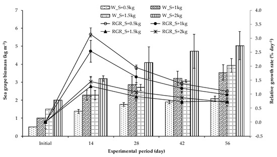 Change in biomass of sea grape co-cultured with shrimp during the experimental duration. The error bars stand for the mean values and standard deviation.