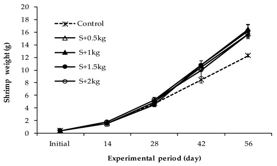 The result indicated that the mean individual weight of shrimp between monoculture and polyculture at different sea grape densities was not distinctly affected in the first 14 days, ranging from 1.54 to 1.78 g. However, the influence from day 28 onwards was more pronounced (Figure 5). After 56 days of culture, the final weight (FW) and length (FL) of shrimp varied between 12.29–16.47 g and 12.64–13.78 cm, respectively, where the lowest and highest values were found in the control and the S + 1 kg treatments.