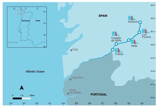 Portugal is home to the largest populations of A. alosa and P. marinus at their southern limit of distribution [15], where both fish species are socio-economically important [25,26,27,28]. Particularly in the Minho River basin in northern Portugal, both species have been commercially targeted for several centuries by riverside communities [22,27,28,29]. Landings, possibly underestimated, are the only source of information on the mortality of both species. The Minho River flows along 300 km in the north-western Iberian Peninsula, draining a basin area of 17,080 km2 [30,31]. In terms of biodiversity, the international Minho River is a Natura 2000 EU site and the estuary is classified as a Special Protection Area under the EU Birds Directive (Directive 2009/147/EC), The Minho estuary has been considered to be at a low chemical contamination level, not raising serious concern [32]. This river is dammed at several locations along its course, being the production of electricity one of the main economic activities in its basin [33]. Five major dams were constructed along the Minho River within a 15-year period: 1955 (Os Peares), 1963 (Belesar), 1966 (Velle), 1969 (Castrello de Miño), and 1970 (Frieira) (Figure 1). In the Spanish Minho basin, above the Frieira dam, there are more than 60 dams distributed over the tributaries and built mainly in the 1950s and 1960s. Despite the economic benefits and benefits of flood prevention, dams have a negative effect on biodiversity and aquatic biochemistry [34].