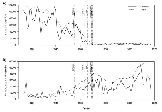The following are available online at https://www.mdpi.com/article/10.3390/fishes6020021/s1, Figure S1: Decomposition of the time series data of (A) Alosa alosa and (B) Petromyzon marinus. The top panel shows original captures, the middle panel shows the resulting trend, and the bottom panel shows the random error. Figure S2: Plot of the Bayesian Inference Coefficient (BIC) value against the number of breakpoints for each species: Alosa alosa (A) and Petromyzon marinus (B) capture data., Table S1: Correlation coefficients between the possible pairs of environmental variables. Table S2: Model results of the Linear Regression for Alosa alosa captures with environmental variables as regressors (intersect data). Table S3: Model results of the Linear Regression for Petromyzon marinus captures with environmental variables as regressors (intersect data). Table S4: Model results of the Linear Regression for Alosa alosa captures with environmental variables as regressors. Table S5: Model results of the Linear Regression for Petromyzon marinus captures with environmental variables as regressors. Table S6: Performance measurements of ARIMA models with the original, log, and Δlog transformed Alosa alosa capture data. The model with log transformation performed better. Table S7: Performance measurements of ARIMA models with the original, log, Δlog, and Δlog12 transformed Petromyzon marinus capture data. The model with Δlog performed better. Table S8: ARIMA models for pre-intervention (1914–1954) capture data of Alosa alosa. Two models were tested, with log and Δlog transformation, as they had previously shown very small differences. Table S9: ARIMA models for pre-intervention (1914–1954) capture data of Petromyzon marinus. Three models were tested, with log, Δlog, and Δlog12 transformation, as they had previously shown very small differences.