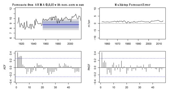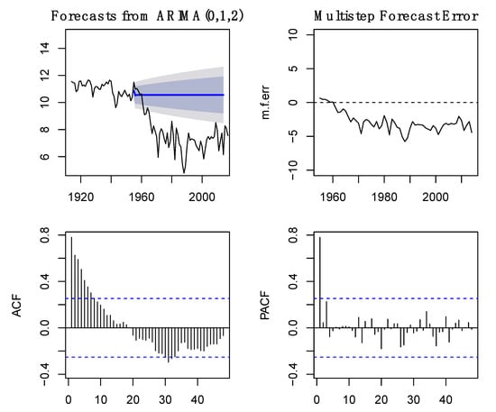 Forecast of captures without dam construction using the ARIMA models based on pre-intervention capture data for Petromyzon marinus. Model accuracy was evaluated through its multistep error, ACF, and PACF. Forecasts are shown by the blue line and shaded grey areas.