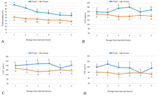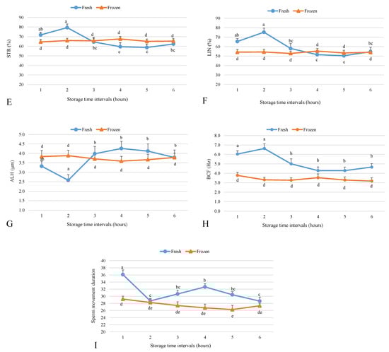 Effect of storage time post-collection on fresh and frozen sperm motility parameters (A–I). Total motility: the percentage of motile spermatozoa; VCL: curvilinear velocity; VSL: straight-line velocity; VAP: average path velocity; LIN: linearity (VSL/VCL × 100); STR: straightness (VSL/VAP × 100); BCF: beat cross frequency; ALH: amplitude of lateral displacement of the spermatozoon head. a,b,c Different superscript letters within the time intervals of fresh semen are statistically different (p < 0.05). d,e Different superscript letters within the time intervals of frozen semen are statistically different (p < 0.05).