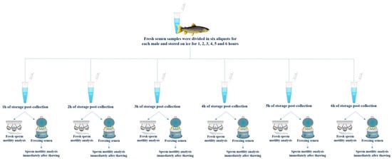 To begin, six aliquots of equal volume from each sperm sample (n = 10 male) were split into 1.5 mL cryovials and stored on ice for 1, 2, 3, 4, 5 and 6 h respectively, until freezing (6 intervals × 10 males = 60 total aliquots). After each storage time interval, an aliquot of fresh semen was subjected to sperm motility evaluation by a Computer-Assisted Sperm Analysis (CASA) system, whilst another one was frozen using the cryopreservation procedure optimized in our previous work [] (Figure 2). Briefly, each semen aliquot was diluted with a freezing extender to reach 0.15 M of glucose, 7.5% of methanol and sperm concentration of 3.0 × 109 sperm/mL. The diluted semen was charged into 0.25 mL plastic straws and equilibrated for 15 min on ice (at the height of 3 cm), lastly the straws were cryopreserved by exposure to liquid nitrogen (LN2) vapor at 3 cm above the LN2 level for 5 min and plunged into LN2. Frozen semen samples were tested after each post-collection storage time, and were thawed at 40 °C for 5 s and immediately evaluated using the sperm motility analysis.
