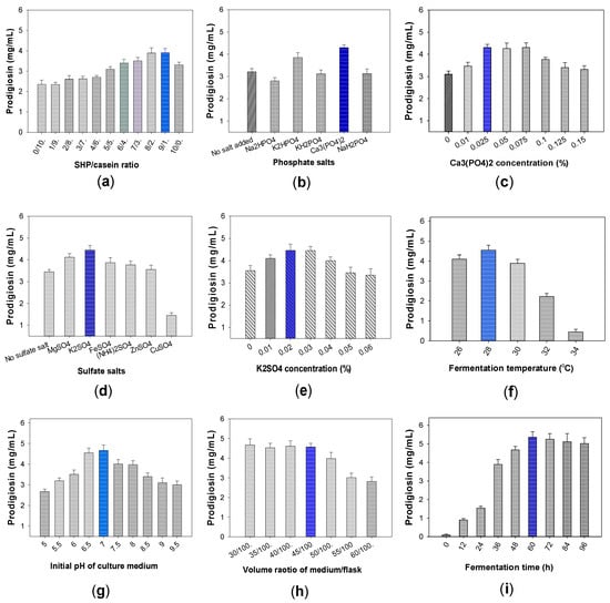 The effect of the SHP/casein ratio (a), sources of phosphate salt (b), Ca3(PO4)2 concentration (c), sources of sulfate salt (d), K2SO4 concentration (e), temperature of cultivation (f), the starting pH of culture broth (g), volume ratio of culture broth/flask (h), and the time duration of cultivation (i). Standard errors (SE) are shown by the error bars in all the figures. The blue bars indicate the parameters chosen for further experiments.