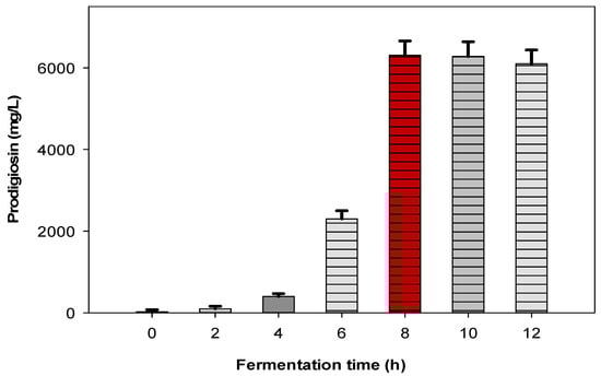 Several ways to ferment have been reported for PG biosynthesis, such as immobilized cultures, batch cultivation, fed-batch cultivation, continuous cultivation, and cultivation using various systems of bioreactors []. Of these, a bioreactor system was found to be a strong tool for the mass bioproduction of PG (large scale production) with high-level productivity and performance in a short cultivation duration []. To approach the goal of biosynthesis of PG at a mass scale, the novel designed medium obtained in the previous experiments (in Section 2.1 of this study) was used for fermentation in the 12 L-bioreactor. The results (Figure 2) show that PG was induced by S. marcescens CC17 with the PG yield increasing with the fermentation time and reaching the maximal PG yield (6310 mg L−1) after 8 h of cultivation. Compared to fermentation in the small flask scale (Figure 1i), PG was produced at a higher yield at the larger scale. Notably, PG was induced with the highest yield during a much shorter cultivation time. In recent years, the studies on PG biosynthesis have dramatically increased []. However, in most prior studies, PG was produced from a commercial nutrient medium at a small scale (Erlenmeyer flasks). In contrast, we established bioprocessing to produce PG from low-cost shrimp discard feedstock at a large scale, by using a 12 L-bioreactor.