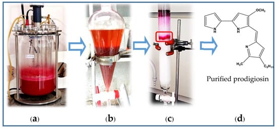 In this study, PG was purified via two simple steps (Figure 3). First, the culture broth fermented by S. marcescens CC17 in 12 L-bioreactor (Figure 3a) was mixed with ethyl acetate for layer separation (Figure 3b), and the ethyl acetate layer rich in red pigment was dried to powder (using rotary evaporator and hot air oven dry) and was loaded on to a silica open column to isolate red pigment compound by elution using methanol and chloroform at the mixture ratios from 0/10 to 2/8 (v/v) (Figure 3c). The purified pigment was confirmed as PG via HPLC, UV/vis, and mass spectral analyses (Figure 4 and Figure 5).