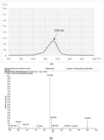 As presented in Figure 4, this pigment metabolite possessed a max absorption wavelength at 535 nm and a molecular weight of 323.186 g/mol, and these recorded spectra are in agreement with those of PG in previous reports [,,,]. In addition, in its HPLC fingerprint, this purified PG appeared as a major single peak at the retention time (RT) of 12.373. This RT of purified PG was approximately similar to that of PG in the previous report with RT of 12.283–12.40 []. Therefore, the purified red pigment was identified as PG. The HPLC spectrum also indicated that the PG compound was isolated with high grade purity, and therefore, it was used to test biological activities in the following experiments.
