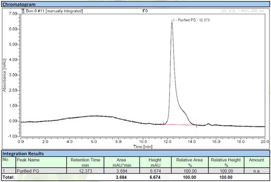 Methanol was used to dissolve the sample. An amount of 3 µL of PG (1 mg/mL) was injected into the HPLC system. C18 column was used to separate the compound by using 70% MeOH in water adjusted to pH 3.0 by using 10 mM ammonium acetate as mobile phase. The column was set for a flowrate of 0.8 mL/min and was kept at 30 °C for 20 min. The PG was detected at 535 nm.