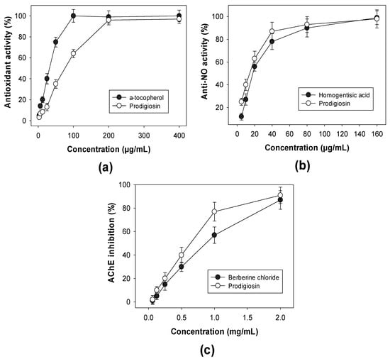 Bioactivities of prodigiosin (PG) including antioxidant activity (a), anti-NO activity (b), and acetylcholinesterase (AChE) inhibitory activity (c). Standard errors (SE) are shown as error bars in all the figures.