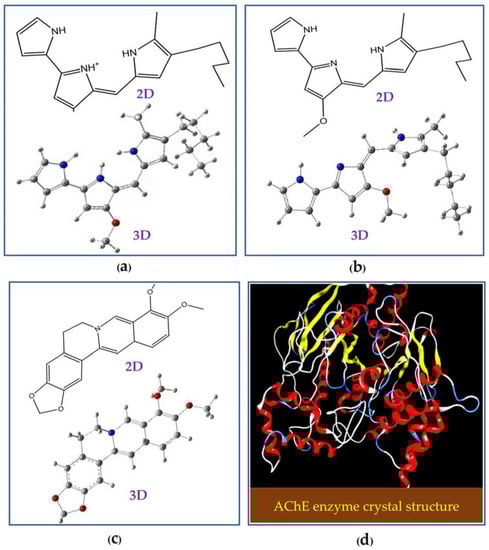 The 2D and 3D structures of cation-PG (a), neutral-PG (b), neutral-BC (c), and the AChE enzyme crystal structure (d).