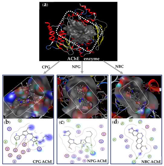 The 3D structures of binding site on AChE enzyme (a). The interactions between the ligands (cation-PG, neutral-PG, and neutral-BC) and the AChE enzyme, labeled as CPG-AChE (b), NPG-AChE (c), and NBC-AChE (d).