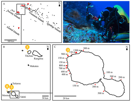 In general, shallow to mesophotic reefs were surveyed along a depth gradient during every deep dive at each of the high islands/atolls described below (Supplementary Materials Table S1). In the Society Islands in Tahiti, 18 sites were monitored with transects ranging from 1,000–6,000 m in length and 50–100 m in width, resulting in a total surface area surveyed of 400,000 m2 for both shallow and mesophotic sites (Figure 1C); at Moorea, four mesophotic sites were monitored with transects ranging from 100–200 m in length and 10–100 m in width, resulting in a total surface area surveyed of 31,500 m2. At Moorea, shallow areas were extensively surveyed from 2007–2008 and less extensively thereafter, with over 700 transects of approx. 400 m in length and 10 m in width, resulting in a total surface area surveyed of 2,800,000 m2. In the Tuamotus: at Tikehau only 1 site was monitored in the mesophotic zone, along a 800 × 20 m transect, resulting in a total surface area surveyed of 16,000 m2 respectively; in the shallow zone, two transects were carried out ranging from 50–800 m in length and 5–20 m in width, resulting in a total surface area surveyed of 16,750 m2; at Rangiroa, only 1 mesophotic site was monitored along a 1000 × 50 m transect, resulting in a total surface area surveyed of 50,000 m2; in the shallow zone, two transects were carried out ranging from 100–1,000 m in length and 50 m in width, resulting in a total surface area surveyed of 55,000 m2. At Fakarava and Manihi, 2 sites were monitored from shallow to the mesophotic zone with two transects of 1000 × 50 and 100 × 50 m at each atoll, resulting in a total surface area surveyed of 55,000 m2 at both shallow and mesophotic depths. In the Australs, at Tubuai 3 mesophotic sites were monitored with transects ranging from 100 m in length and 20–50 m in width, resulting in a total surface area surveyed of 9000 m2, and 2 shallow sites were monitored with transects ranging from 100–500 m in length and 5–50 m in width, resulting in a total surface area surveyed of 7500 m2.