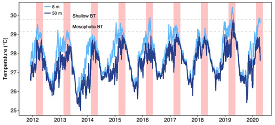 Long-term benthic temperature recordings on the outer reef in Moorea, French Polynesia (17°28.870′ S, 149°53.990′ W) contrasted between shallow (8 m) and mesophotic (50 m) depths. Austral summer months (February, March and April) are indicated with red shading. BT = bleaching threshold temperature.