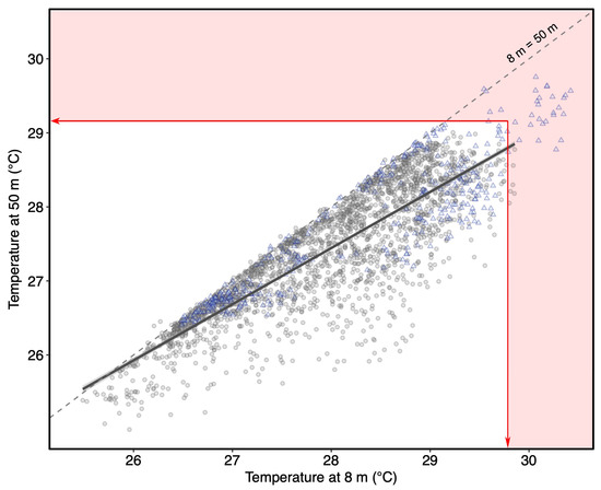 Linear regression between water temperatures at 8 m and 50 m monitored from October 2011 to April 2020 (grey-filled circles; excluding the years with thermal anomalies 2016 and 2019) on the coral reef outer slope in Moorea. Temperature recordings from October 2018 to September 2019 (during the marine heatwave and severe coral bleaching event in 2019) are shown with a blue triangle (▲). The red zone represents when the bleaching thresholds at each depth (shallow BT: 29.79 °C; mesophotic BT: 29.16 °C) were exceeded.