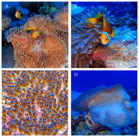 - Dixon, A.K.; Needham, D.; Al-Horani, F.A.; Chadwick, N.E. Microhabitat use and photoacclimation in the clownfish sea anemone Entacmaea quadricolor. J. Mar. Biol. Assoc. UK 2014, 94, 473–480. [Google Scholar] [CrossRef]