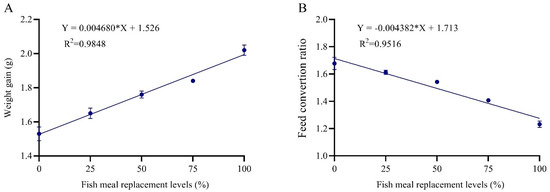 The linear regression between weight gain (A) and feed conversion ratio (B), and the percentage of dietary fishmeal replacement level for grey mullet, Mugil cephalus, fed five experimental diets for 60 days.