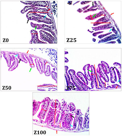 Photomicrograph from intestine of the control (Z0) group showing normal histo-morphological structures of the villi and intestinal whale. The increase in ZBM levels show a comparatively increase in both villous length, crypts length and muscle thickness, with a characteristic increase in the number of goblet cells. Villous length (black arrow), crypt depth (blue arrow), villous width (green arrow), and muscle thickness (red arrow). Z0 = diet without zooplankton biomass meal (ZBM) inclusion; Z25, Z50, Z75, and Z100 have 25, 50, 75, and 100% fishmeal replaced with ZBM, respectively.