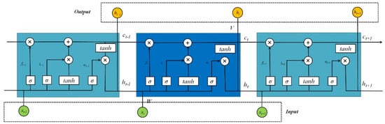 The LSTM-NN consists of an input layer, one or more implicit layers and an output layer, and uses memory cells to store knowledge, the LSTM-NN model structure is shown by Figure 1. An LSTM block mainly contains memory cell states, forgetting gates, input gates and output gates, where memory cell states are the key elements throughout the LSTM block. Also, with the help of these three gates, certain information can be added and removed selectively []. In the figure, x is the input, h is the hidden state that can be given the ability to remember, and t is the storage time. W is the input weights, U is the recurrent weights, and the activation functions σ and tanh are the sigmoid function between 0 and 1 and hyperbolic tangent function, respectively, both of which have the effect of enhancing the nonlinearity of the artificial neural network.