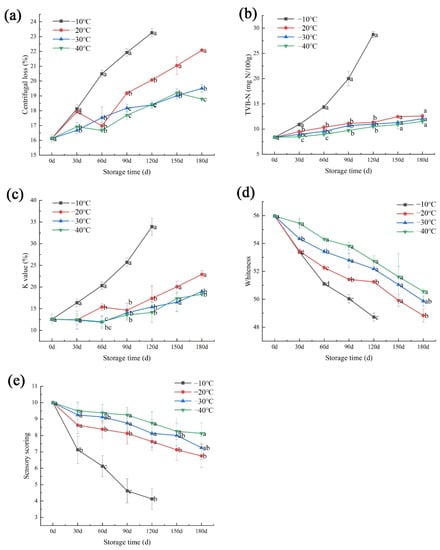 Water holding capacity (WHC) is one of the important characteristics reflecting the quality of fish, which can be reflected by centrifugal loss. The changes of centrifugal loss with storage time at different temperatures is shown in Figure 2a. The initial centrifugal loss was 16.13% and increased significantly with storage time. After 90 days, the centrifugal loss of large yellow croaker stored at −10 °C had reached 21.93% which was 5.80% higher than the initial level, and after 180 days of storage, the centrifugal loss of large yellow croaker stored at −20 °C, −30 °C and −40 °C increased by 5.95%, 3.38%, and 2.65%, respectively. This may be that the higher the storage temperature of the large yellow croaker, the more likely oxidation reaction of fat and protein occur, which results in higher centrifugal loss as they are unable to hydrate with the back-percolating water [].