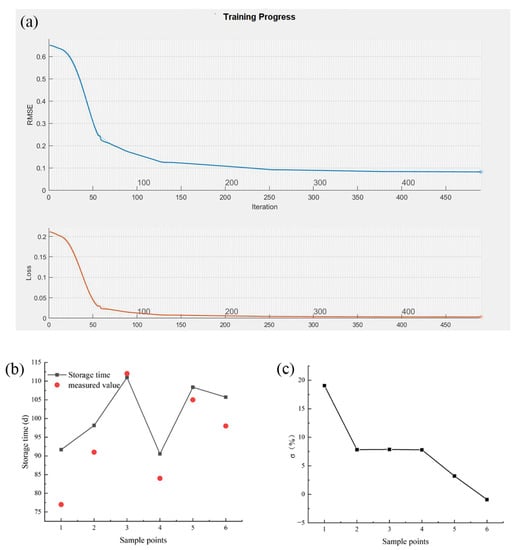 The effects of frozen storage and storage temperature on the quality of large yellow croaker were modeled and calculated with MATLAB. To evaluate the effectiveness of our developed LSTM-NN model based on the predicted storage time of glazed large yellow croaker at different temperatures, data from a total of 26 sample points measured at −10, −20, −30, and −40 °C were disrupted and randomly ordered and used to train the model. The thresholds and weights of the connection parameters between neurons were optimized in order to minimize the RMSE of the predicted and measured values during training []. The changes of RMSE and loss are shown in Figure 4a. When training was performed, the model performed 500 iterations in 16 s, the RMSE and loss kept decreasing rapidly and basically stabilized after the 150th cycle, which indicated that the LSTM-NN model can predict the shelf-life time well after several training sessions.
