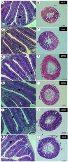 Histological changes in the anterior third of the intestines of juvenile Nile tilapia when fed different levels of AM or CLO, for 87 days, at 22 °C. Figures (A,C,E,G,I,K) represent a partial cross-section of the intestine of fish fed 0AM, 5AM, 10AM, 20AM, 40AM, and CLO diets, respectively. Goblet cells are identified with the arrowhead. Bar: 50 µm. Figures (B,D,F,H,J,L) represent a cross-section of the whole intestine. Bar: 500 µm. Staining: H&E.