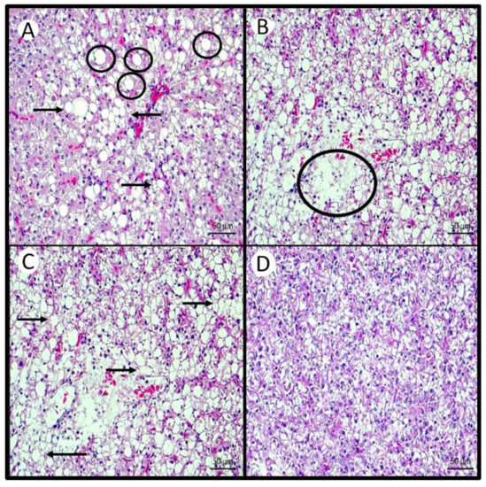 Histological changes in the hepatopancreas of Nile tilapia juveniles fed different levels of Aurantiochytrium sp. meal (AM) or a cod liver oil (CLO)-supplemented diet for 87 days, at 22 °C. (A,B) High intensity of macrosteatosis (circle) and microsteatosis (arrow) in fish fed the 0AM diet. (B) High intensity of necrosis (circle) in fish fed the 0AM diet. (C) High loss of hepatocyte nucleus (arrow) in fish fed the 0AM diet. (D) Smaller variation in hepatocyte size in the hepatopancreas and lower intensity of macrosteatosis, microsteatosis, and necrosis in fish fed the 40AM diet.