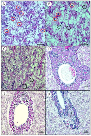 Histological changes in the hepatopancreas of Nile tilapia juveniles fed different levels of Aurantiochytrium sp. meal (AM) or a cod liver oil (CLO)-supplemented diet for 87 days, at 22 °C. (A) High intensity of nuclei with karyolysis (red circle) in fish fed the 20AM diet. (B) High intensity of nuclei with karyorrhexis (black circle) in fish fed the 40AM diet. Nuclei with karyolysis are indicated by red circles. (C) Lower intensity of nuclei with karyolysis and karyorrex in fish fed the 5AM diet. (D) Nuclei in pancreatic acini without alterations in fish fed the 0AM diet. (E) Loss of nuclei in pancreatic acini in fish fed the 5AM diet (alteration indicated by asterisks). (F) Macrophage with bilirubin in fish fed the CLO diet (alteration indicated by arrow).