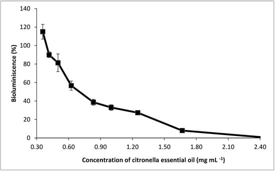 Percentage of V. fischeri bioluminescence with respect to the value of the controls, at increasing concentrations of citronella essential oil.