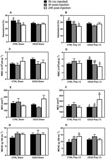 Hematological parameters in S. aurata either sham or poly I:C injected after 60 days of feeding with either CTRL or CEO2. Juveniles of gilthead seabream were sampled prior to injection (0 h), and then 4 and 24 h post-injection. Hematocrit response to sham (A) and poly I:C (B) injections; total white blood cells (WBC) response to sham (C) and poly I:C (D) injections; mean corpuscular volume (MCV) response to sham (E) and poly I:C (F) injections; and mean corpuscular hemoglobin concentration (MCHC) response to sham (G) and poly I:C (H) injections. Data are presented as mean ± SEM (n = 8–9). Letters indicate significant differences within injection and feed supplementation type among timings post-injection (p < 0.05, one-way ANOVA followed by a Sidak’s post hoc analysis).