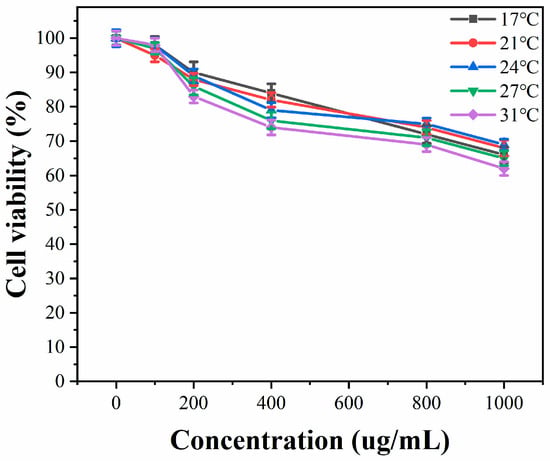 As shown in Figure 1, crucian carp epidermal mucous cells under five temperature treatments were tested for toxicity to human pancreatic cancer cell line 8988t. The results showed that as the concentration of epidermal mucus increased, the survival rate of cell lines showed a downward trend within a certain range. When the fish epidermal mucus was 1000 μg mL−1, the survival rate of the cell line reached more than 65%. The epidermal mucus under five temperature treatments had no toxic effect on the cell line [].