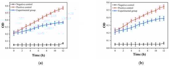 The ability of bacterial isolates to grow in fish epidermal mucus was examined in a 96-well plate to study the use of marine pathogens (V. harveyi) to determine the bactericidal activity in mucus samples. V. harveyi was grown on agar plates at 25 ± 2 °C. Then, we picked fresh single colonies and diluted them with a 5 mL nutrient broth, and then we incubated them in an orbital incubator at 28 °C and 150–200 rpm for 12 h. Then, the mucus bactericidal activity was measured []. A portion of the supernatant mucus was taken and autoclaved at 121 °C for 15 min. Bacterial suspension and mucus samples were serially 2-fold diluted with PBS. Then, 100 µL of bacterial diluent and an equal volume of autoclaved epidermal mucus were placed in a 96-well plate. The positive well contained 100 μL of bacterial suspension and 100 μL of nutrient broth. Negative wells contained 100 μL of autoclaved epidermal mucus and 100 μL of a nutrient solution. The experiment was carried out in triplicate. The plates were incubated at 28 ± 2 °C. Every 1 h, the optical density (OD) at 600 nm was measured with a microplate reader for a total of 12 h. The bacterial survival rate was calculated by the ratio of the optical density of the experimental group and the positive control group, and the result is expressed as a percentage (100%).