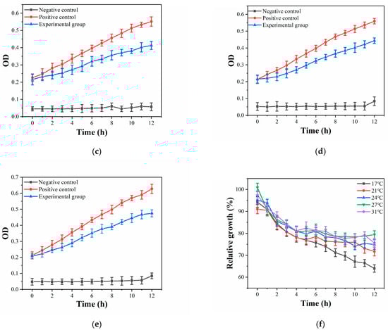 The growth of bacteria was analyzed in crucian carp epidermal mucus under five temperature treatments, and the V. harveyi selected in this study is a common pathogen of marine organisms. The results in Figure 2 show that during the culture period, the growth of the number of V. harveyi in the nutrient broth of the positive control group was observed to gradually increase over time. As shown in Figure 2a–e, the number of V. harveyi in the experimental group gradually increased under different epidermal mucus conditions, but the increase in the same period was less than that of the positive control group. The crucian carp epidermal mucus under the five temperature treatments all had similar results. In addition, comparing the five experimental groups in Figure 2f shows that as the temperature increased, the antibacterial ability of the crucian carp epidermal mucus gradually weakened, though the values were all significantly higher than those of the negative control group. This indicates that within a certain temperature range, the epidermal mucus of different treatments had antibacterial activity, and as the temperature increased, the survival rate of V. harveyi gradually increased (p < 0.05). On the contrary, when the temperature decreased, the metabolic activity of V. harveyi was reduced, and the survival rate of V. harveyi was also reduced (p < 0.05).