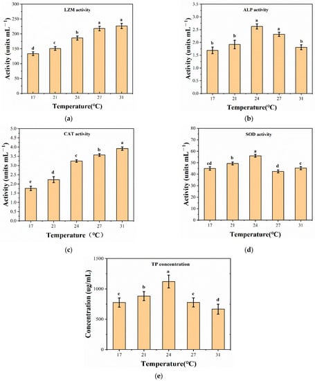 The TP concentration and four enzyme activities in crucian carp epidermal mucus under five different treatments were tested. The activity of LZM gradually increased with the increase of temperature. Compared to the control group (17 °C), LZM activity increased by 12.78%, 39.85%, 63.91%, and 69.92% under the other four temperature treatments (Figure 3a). the ALP activity first increased and then decreased with the increase of temperature. Compared to the control group (17 °C), the ALP activity under the other four temperature treatments increased by 14.29%, 56.55%, 38.09%, and 7.74% (Figure 3b). Compared to CAT (17 °C), the other four temperature treatments increased by 14.6%, 53.36%, 67.92%, and 84.43% (Figure 3c). SOD activity first increased and then decreased with increasing temperature. Compared to the control group (17 °C), the SOD activity under the other four temperature treatments increased by 9.79%, 24.64%, −5.3%, and 0.73% (Figure 3d). The SOD level increased from 17 to 24 °C, then decreased at 27 °C, returned to the control level at 31 °C, and stabilized at 27 and 31 °C. Compared to the control group (17 °C), the total protein concentration under the other four temperature treatments increased by 13.68%, 44.52%, 0.22%, and −14.06% (Figure 3e). The total protein concentration first increased and then decreased with the increase of temperature, and it reached its highest point at 24 °C.