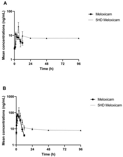 Mean ± SEM parent drug and metabolite concentration in plasma after administration of a single dose of meloxicam (1 mg/kg) orally (A) or intramuscularly (B) (n = 6) from 0 to 96 h post-administration in tilapia.