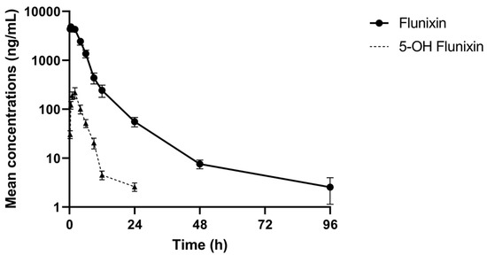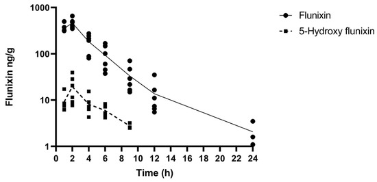 - Kissell, L.; Smith, G.; Leavens, T.; Baynes, R.; Wu, H.; Riviere, J. Plasma pharmacokinetics and milk residues of flunixin and 5-hydroxy flunixin following different routes of administration in dairy cattle. J. Dairy Sci. 2012, 95, 7151–7157. [Google Scholar] [CrossRef] [PubMed]