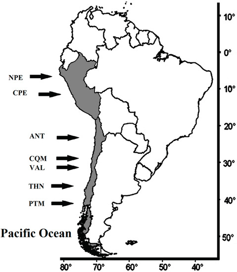 A total of 7142 individuals belonging to three species—E. ringens (n = 2050), T. murphyi (n = 4021) and M. gayi (n = 1071)—were collected from different localities in the SEPO, including two landing ports in Peru—Paita (Northern Peru, NPE), 5° S; and Callao (Central Peru, CPE), 12° S—and five landing ports along the Chilean coast—Antofagasta (ANT); 23°40′ S; Coquimbo (CQM), 30° S; Valparaiso (VAL), 33° S; Talcahuano (THN), 36°40′ S; and Puerto Montt (PTM), 41°30 S—covering a spatial scale of more than 4600 km. The closest landing ports were Coquimbo and Valparaiso, separated by ca. 300 km. (Figure 1). The temporal scale reached a maximum of 24 years, between 1993 and 2017.