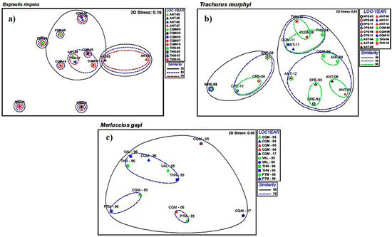 Non-metric multidimensional scaling (nMDS) of parasite communities in three fish species in the southeastern Pacific Ocean: (a) E. ringens; (b), T. murphyi; (c), Merluccius gayi. Circles represent similarity levels between samples of locality–year.