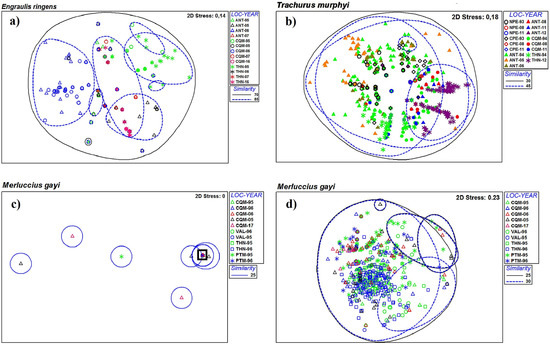 For the three host species, the ANOSIM showed significant differences in the parasite communities at the temporal scale. For E. ringens (global R = 0.124; p < 0.001), the pairwise test was significant for all pairs of years except 1995/2007 (R = −0.088; p > 0.05) and 2005/2007 (R −0.041 = p > 0.05). For T. murphyi (global R = 0.126; p < 0.001), the pairwise test was significant for all pairs of years except 2005/1993 (R = −0.047; p > 0.05), 2006/1993 (R = 0.006; p > 0.05) and 2008/2011 (R = −0.002; p > 0.05). Finally, for M. gayi (global R = 0.166; p < 0.001), the pairwise test was significant for all pairs of years except 1995/2017 (R = 0.00; p = 0.465), 2005/2017 (R = 0.032; p = 0.353) and 2006/2017 (R = −0.094; p = 0.781). The PERMANOVA showed significant differences in the parasite communities for different years: for E. ringens, pseudo-F = 65.609 (p < 0.0001); for T. murphyi, pseudo-F = 83.054; and for M. gayi, pseudo-F = 15.861 (p ≤ 0.0001). Pairwise tests showed significant differences for all pairs of comparison across the three host species.