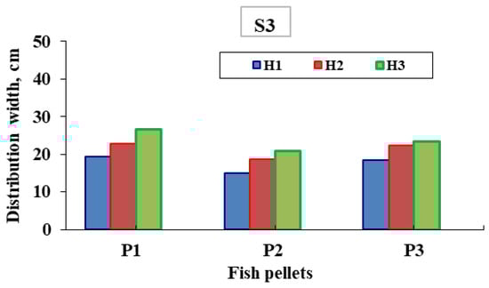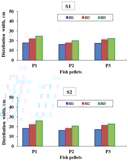 The small floating pellets had the maximum distribution average width of 26.6 cm at 14 rpm rotation and feeder height of 70 cm, while the medium submersible pellets had the lowest distribution average width of 14.9 cm at 14 rpm rotation and feeder height of 40 cm. The fact that the optimal distribution was at a quick pace for the highest high for small pellets was clarified by these findings, which could be due to the small volume of pellets. When all the fish in the tank are fed in the same way and have equal access to food, competition is minimized [