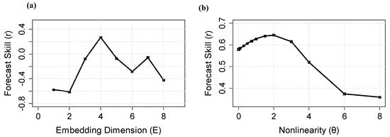 where. At this stage, we use Pearson’s correlation between observed and predicted values to measure the prediction ability of the simplex projection method. The optimal embedding dimension, , is determined to maximize the Person’s correlation coefficient.