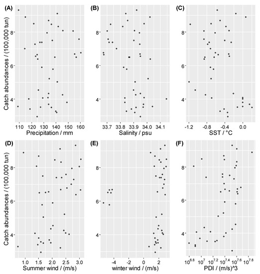 Relationships (A) between catch abundance and precipitation, (B) between catch abundance and salinity, (C) between catch abundance and SST, (D) between catch abundance and summer wind, (E) between catch abundance and winter wind, (F) between catch abundance and PDI. Here, mm is millimeter; psu is practical salinity units; SST is sea surface temperature; °C is degrees Celsius; m/s is meter per second; PDI is power dissipation index of tropical cyclone.