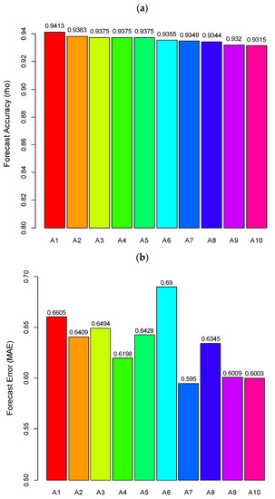 The selected best ten models: (a) forecast skill (rho) (b) forecast error (MAE).