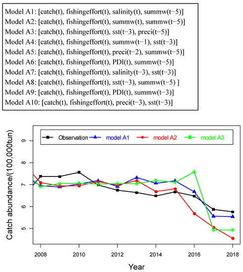 The best three models selected based on the metrics are: A1 [catch(t), fishingeffort(t), salinity(t), summw(t−5)], A2 [catch(t), fishingeffort(t), summw(t), summw(t−5)], and A3 [catch(t), fishingeffort(t), SST(t−3), Preci(t−5)]. As shown in Figure 4, forecast accuracy for these models exceeds 0.93 (= 0.941, 0.938, and 0.937, respectively, at ), and their forecast errors are lower than 0.7 (MAE = 0.661, 0.641, and 0.649, respectively), where fishing effort has been shown to be the common variable, and the variables (salinity(t), summw(t−5), summw(t), sst(t−3), and preci(t−5)) are identified as the most important external environmental factors determining catch abundance. Model A1, <catch(t), fishingeffort(t), salinity(t), summw(t−5)>, shows the best prediction performance in terms of the combination of two metrics from Figure 4.