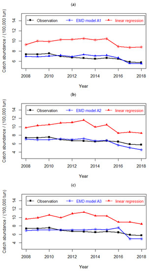To validate performance of the selected models, we predict catch abundance during the period from 2008 to 2018 by EDM models constructed with the data during the period from 1977 to 2007. All three models yield statistically significant predictions with p < 0.05. Figure 5 clearly shows the excellent prediction performance of these models, which are closely aligned to the observed trends in catch abundance data. However, there are still some discrepancies between observed and prediction points in each model, such as 2016 by models A2 and A3, 2017 by model A3, and 2018 by model A2. These prediction errors might be explained by an insufficient length of the time series of data used in construction of the EDM models.