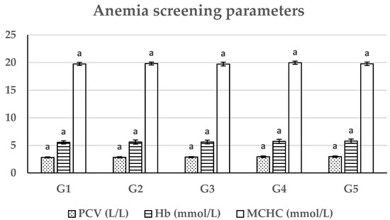 Effect of soybean meal partial substitution with autoclaved and acid-treated SBp meals on anemia screening parameters in African catfish (Clarias lazera) (mean ± SE), n = 30. (G1: Basal-diet-fed group (control), G2: 25% autoclaved SBp fed group, G3: 25% acid-treated SBp fed group, G4: 50% autoclaved SBp fed group, G5: 50% acid-treated SBp fed group.)