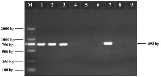 Identity confirmation of non-GM carp and GH-ttc. M: marker D2000; 1–3: GH-ttc; 4–6: non-GM carp; 7: the positive control for GH gene; 8: the negative control; 9: water control. Primer sequence: F: 5′-TGGCGTGATGAATGTCG-3′; R: 5′-AACACGTATGACTGC-3′.