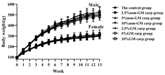 Following a 5-day acclimation period, 70 male and 70 female rats were randomly divided into seven groups, with 10 male rats and 10 female rats in each group. Six treatment groups were fed with a basal diet containing 2.5%, 5%, or 10% (w/w) GH-ttc or 2.5%, 5%, or 10% (w/w) non-GM carp; the basic control group were fed with a commercially available rodent diet. Animal management and housing procedures were carried out in compliance with the OECD Principles of Good Laboratory Practice. All rats were fed the respective diets for 13 weeks and were weighed weekly.