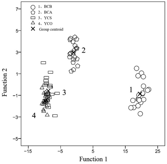 The LDA of samples from YCS, YCO, BCB, and BCA was carried out using all 11 elements. Six elements (i.e., Fe, Mg, Al, Ca, K, and Cu) were selected by stepwise discriminant method in the process of linear discriminant analysis to establish the discriminant function. The discrimination results (Table 3, Figure 1) revealed significant differences between the foreign and genuine crabs before and after bathing in the same month, which was accurately identified using LDA. For “bathed” crabs, the accuracy of discrimination was 100%. In contrast, the changes between samples from YCS and YCO were insignificant. From the scatter diagram, the trend of changes in mineral elements in the third pereiopod of Yangcheng Lake crab plateaued and the discriminant analysis could not accurately distinguish samples from YCS and YCO.