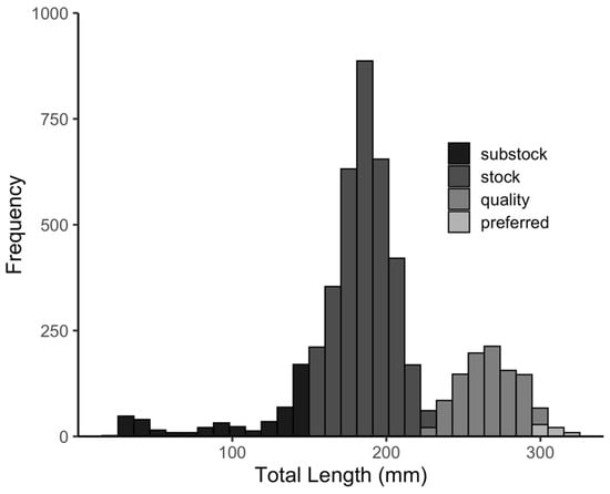 - Gabelhouse, D.W., Jr. A length-categorization system to assess fish stocks. N. Am. J. Fish. Manag. 1984, 4, 273–285. [Google Scholar] [CrossRef]